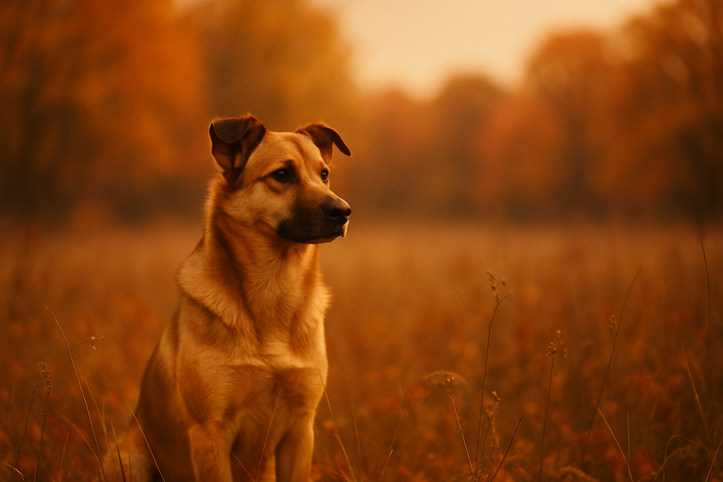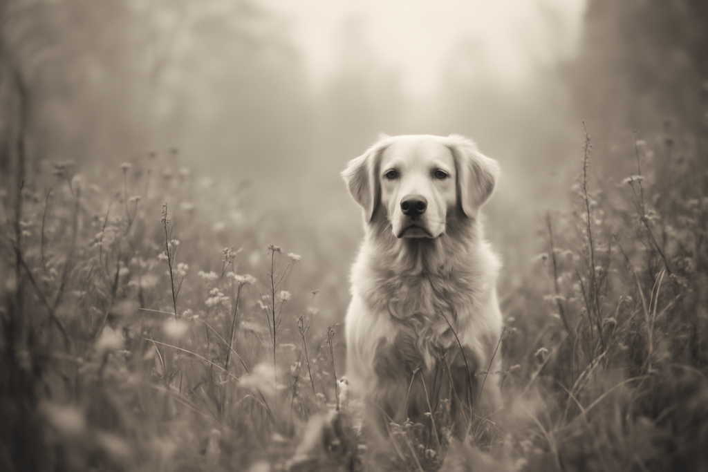 Let’s create an image of dog in an autumn field muted monochrome with a shallow depth-of-field image of a dog in an autumn field