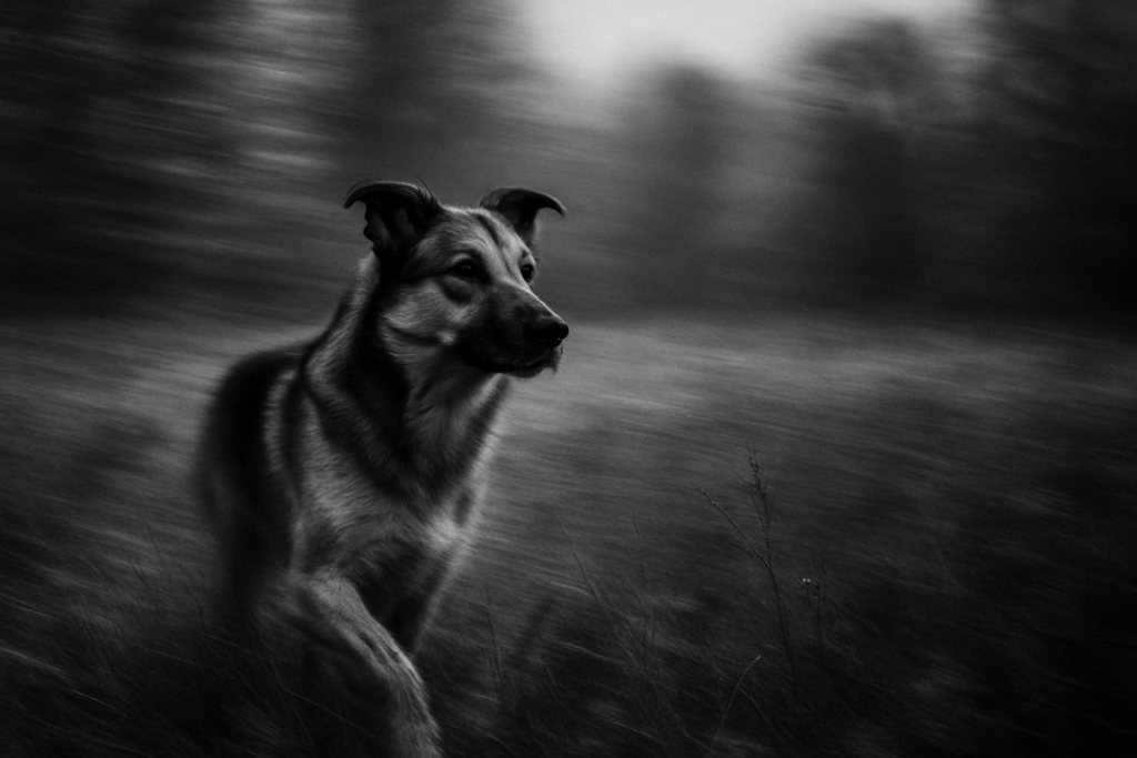 NEXT PROMPT: I’d like a hard contrast monochrome with motion blur image of a dog in an autumn field