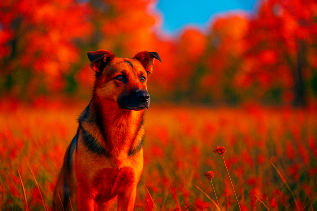 NEXT PROMPT:ok..lets dog in field, vibrant, high-contrast color with shallow depth of feel